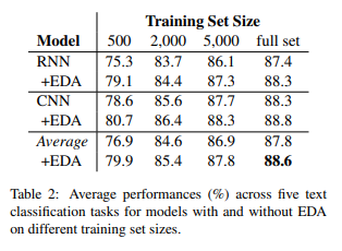 EDA를 적용하였을 떄 평균적으로 0.8% 정확도가 증가를 하였고 특히 train set이 500개 일 때는 3%의 정확도가 증가를 하였다.