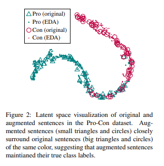 EDA를 적용하면 기존 문장의 의미가 변형될 수 있기 때문에 해당 실험을 진행하였다. 먼저 LSTM 모델에 대해서 긍부정 데이터를 학습을 시키고 그다음 테스트세트에 대하여 EDA를 진행하여 각각의 기존 문장에 대하여 추가적인 9개의 데이터를 증강을 하였다. 그 다음 t-SNE를 이용하여 해당 데이터들을 2D로 visualize 하였다. 결과는 기존의 의미가 잘 보존된다는 결과를 보여주었다.