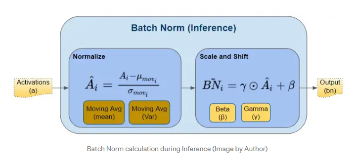 추론 시에는 Batch Norm에서 평균과 표준편차를 계산해주는 작업을 실시하지 않게 된다. 가령 추론시에는 input data가 하나라면(batch size가 1인 상황) 어차피 평균과 표준편차를 계산할 수 없어 정규화를 하지 못하게 된다.