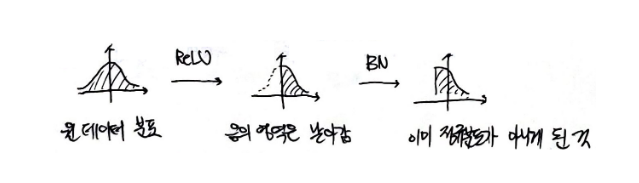 하지만 위의 다른 블로그를 보면 그래프의 분포를 예로 들어 activaton function 이전에 Batch Norm을 적용해주는 것이 좋다고 한다. ReLU로 예를 들면 ReLU는 음의 값은 전부 0으로 처리해버리므로 이후에 Batch Norm을 적용하면 이미 정규화될 수 없는 데이터를 정규화하기 때문이라고 한다.