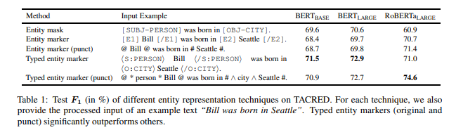 따라서 이러한 점을 개선하여 typed entity marker를 제안하였으며 RoBERTa를 사용하여 TACRED, TACREV, Re-TACRED 데이터셋에서 sota 성능을 달성하였다.