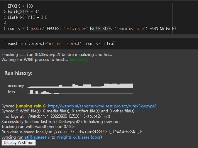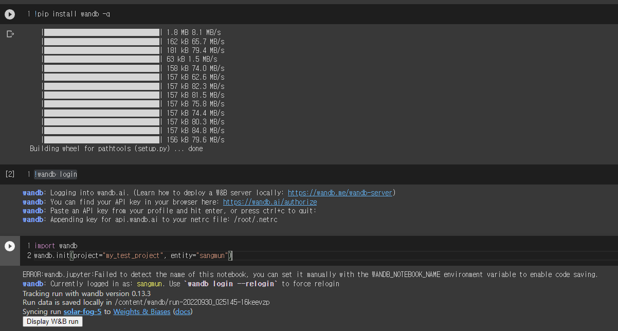 다음은 colab으로 접속하여 wandb를 설치를 해주고, 로그인 -> init까지 실행해준 모습니다.