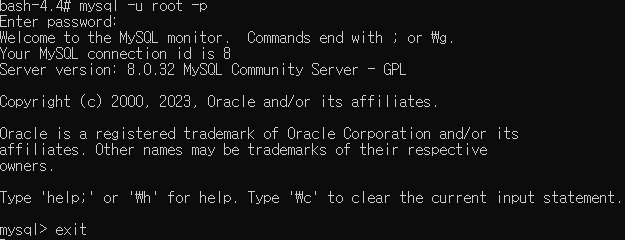 좀 전에 생성한 mysql 서버에 접속을 해보면 아래와 같이 접속이 되고 mysql도 mysql -u root -p 명령어로 접속이 된다.