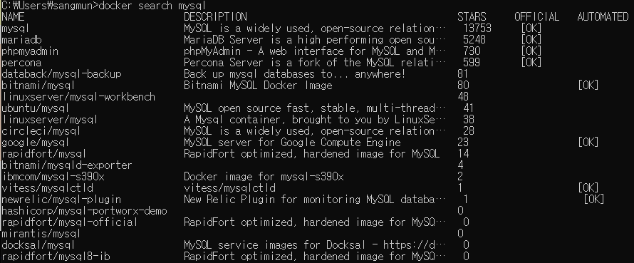 mysql 관련 이미지를 찾고 싶으면 docker search mysql명령어를 입력하면 된다.