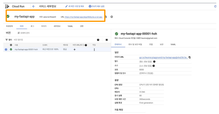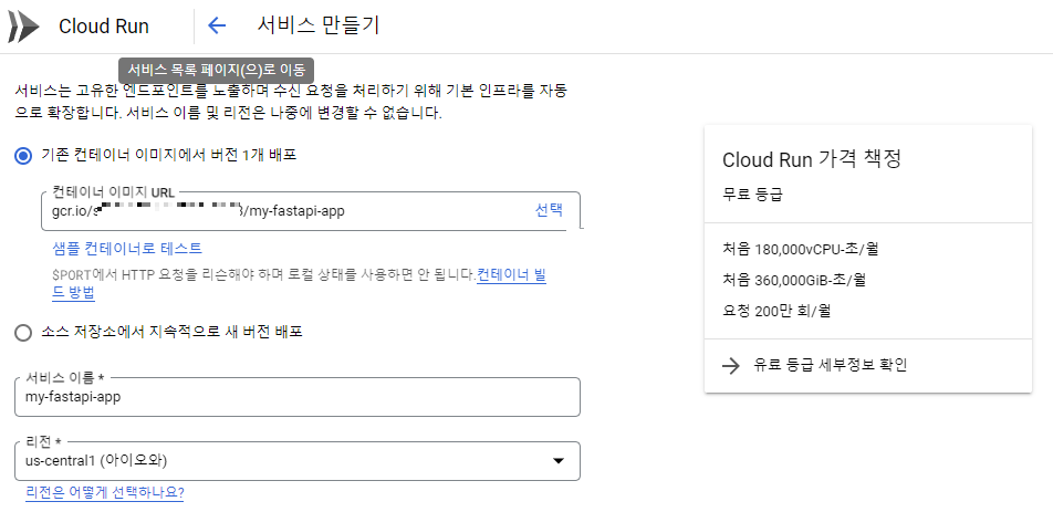 Cloud Run 생성에서 컨테이너 이미지 URL에 방금전 GCR에 push할때 사용했던 gcr.io/gcp 프로젝트 이름/이미지 이름 형태의 주소를 넣어주기만 하면 되기 때문이다.
