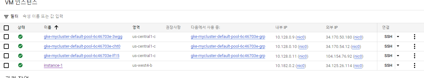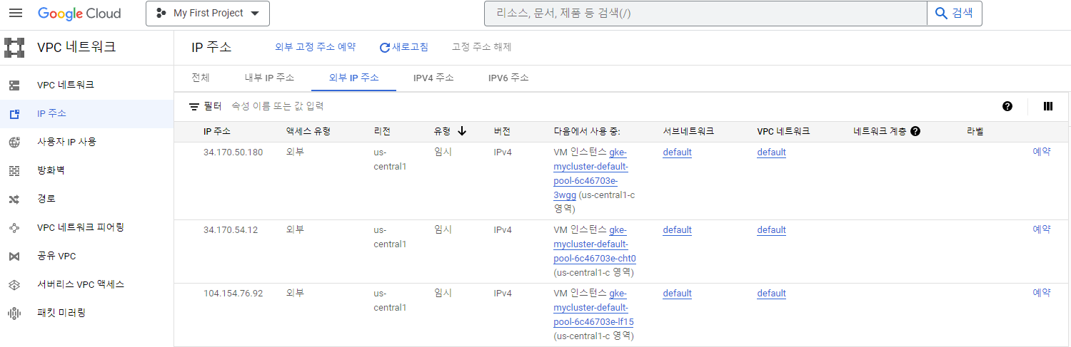 Compute Engine 탭에서 나와서 VPC 네트워크 탭의 IP 주소 탭으로 이동하면 다음과 같이 현재 내가 운영중인 인스턴스들의 IP 현황이 나온다.