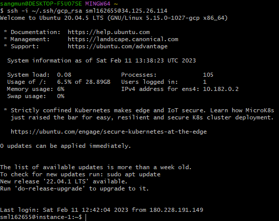 본문에서는 Cloud Shell 을 이용해서 인스턴스에 접속하는 방법을 살펴봤는데, 이번에는 사용자의 머신에서 직접 SSH 를 접속하는 방법에 대해서 설명한다. 환경은 리눅스(우분투)지만 다른 OS라도