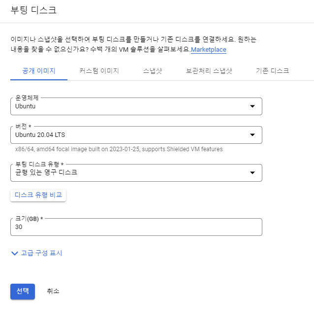 또한 부팅 디스크 옵션도 정할 수 있다. 나는 Ubuntu 이미지에 기본적이 30G의 용량만 주었다.