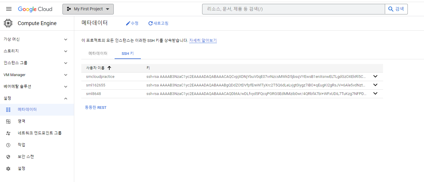 다음으로는 Compute Engine 탭의 설정 > 메타데이터로 이동을 한다.