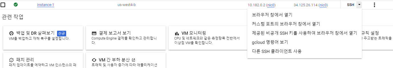 Compute engine에서 각 인스턴스의 맨 오늘쪽에 있는 SSH 메뉴를 클릭해보면 인스턴스에 접근할 수 있는 다양한 메뉴들이 있다. 간단하게 브라우저를 이용해서 접속도 가능하다. 하지만 로컬에서 접속하는 방법을 알아볼 예정이다.