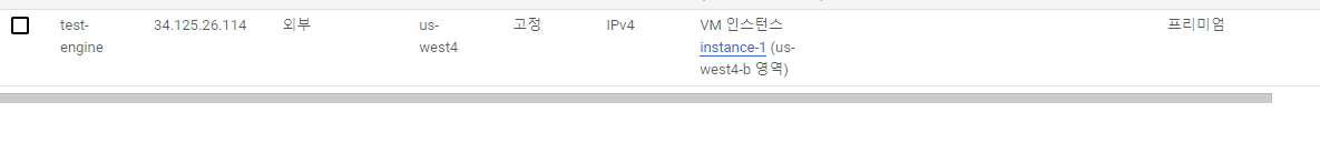 다시 Compute engine의 인스턴스 메뉴로 들어가면 해당 인스턴스에 고정 IP가 할당되었다고 표시되게 된다.