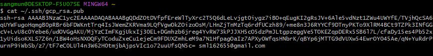 cat 명령어로 public key의 내용을 확인하면 아래와 같이 출력이 되고 해당 내용을 복사해서 gcp의 메타데이터로 가져가면 된다. 나는 생성할때 USERNAME에 sml162655@gmail.com이란 주소를 사용해서 아래와 같이 출력이 되었다.