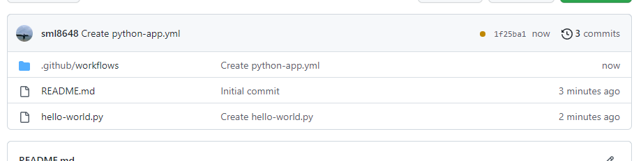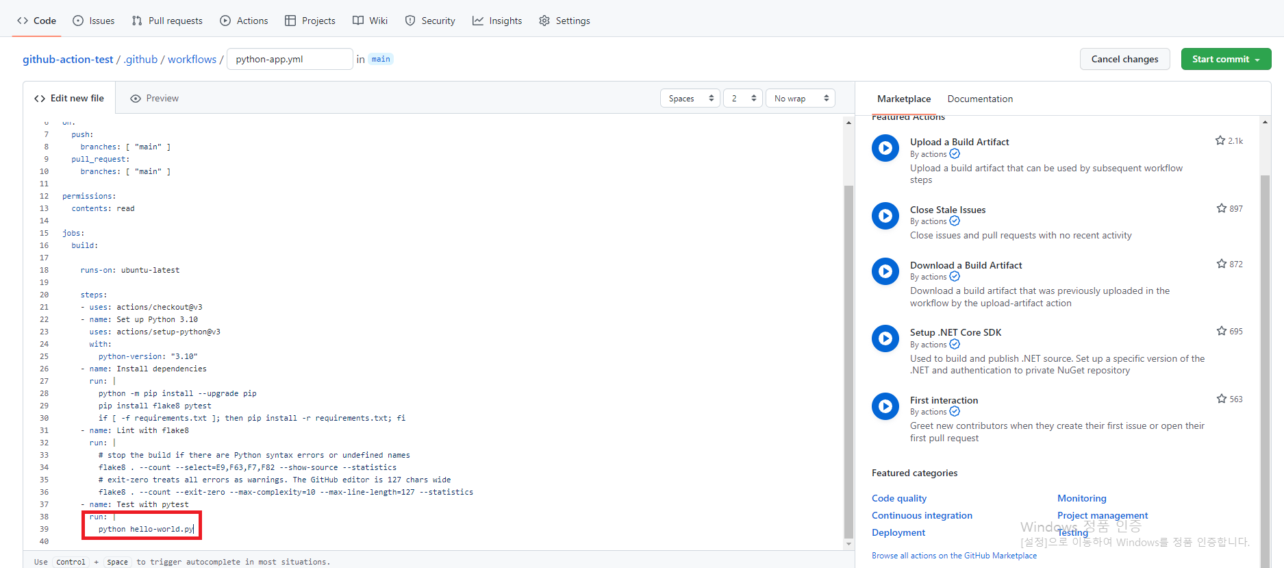 다음과 같이 python-app.yml 파일이 생성되고 start commit을 누르면 github action이 시작된다.