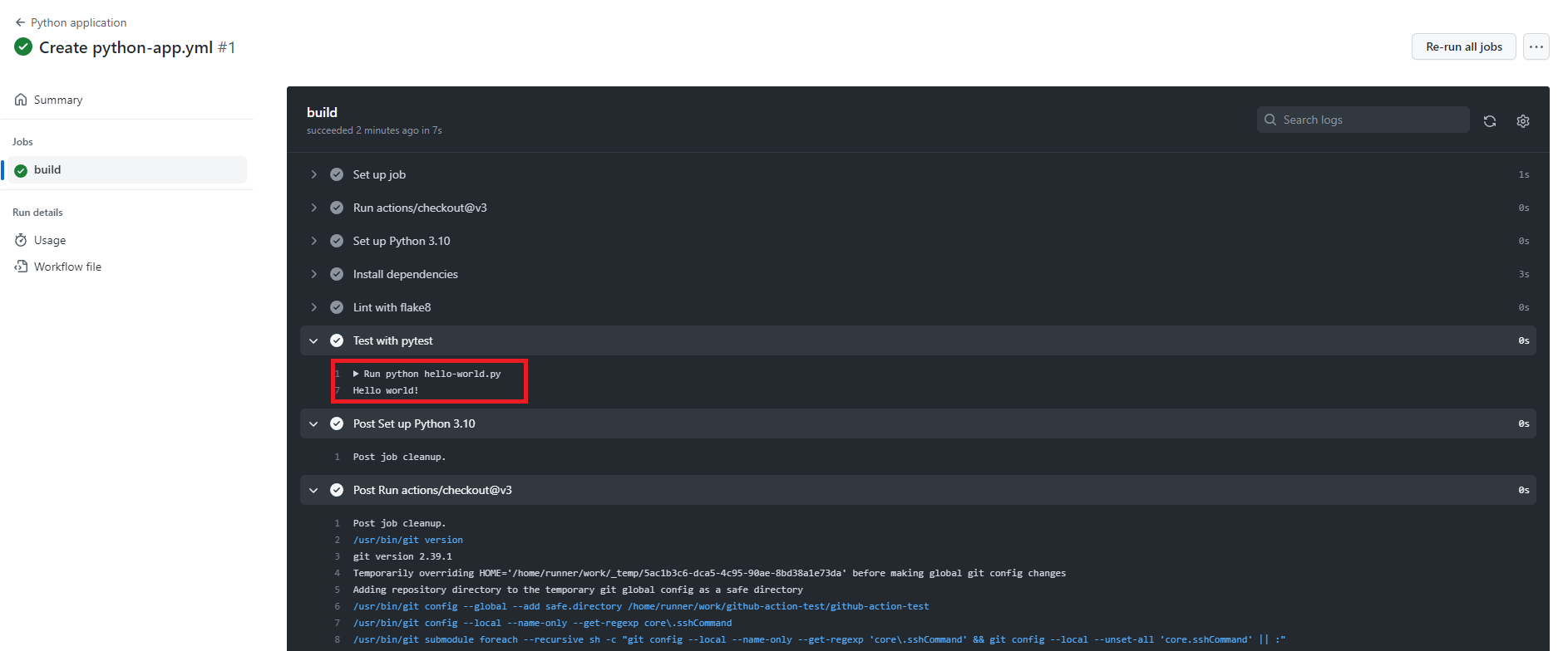 명령을 수행하는 동안의 세부사항을 확인할 수 있다. 지금의 경우는 성공적으로 github action이 수행되어 이전에 작성했던 python script의 hello world가 출력된것을 확인할 수 있다.