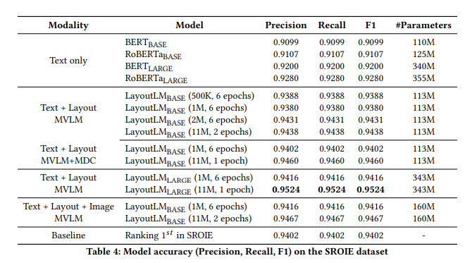 또한 LayoutLM의 파라미터를 어떠한 모델의 파라미터로 초기화하느냐도 영향을 미쳤다. RoBERTa가 가장 성능에 좋게 영향을 미치는 것을 확인할 수 있다.