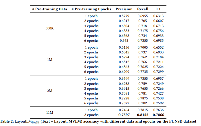 아래는 구체적으로 FUNSD dataset에 fine-tuning 하기 이전에 사전학습에 사용된 데이터의 양과 epoch에 따른 비교이다. 더 많은 데이터와 epoch를 사용하였을 때 성능이 올라가는 것을 확인할 수 있다.
