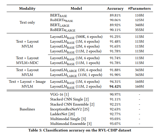 마지막으로, RVL-CDIP 데이터셋을 사용하여 문서 이미지 분류 task의 결과는 아래와 같다. 문서 이미지는 대부분 다양한 스타일과 레이아웃으로 된 텍스트이기 때문에 일반적인 이미지와는 다르며. 이를 위해 기존의 이미지 기반 모델과 BERT, RoBERTa와 같은 텍스트 기반 모델을 비교해 보았고, LayoutLM 모델이 가장 성능이 좋았다. 결과적으로, LayoutLM는 이미지 기반 모델과 비교했을 때도 더 좋은 성능을 보였으며, 이미지 임베딩을 추가로 사용하면 94.42%의 높은 정확도를 달성하였다.