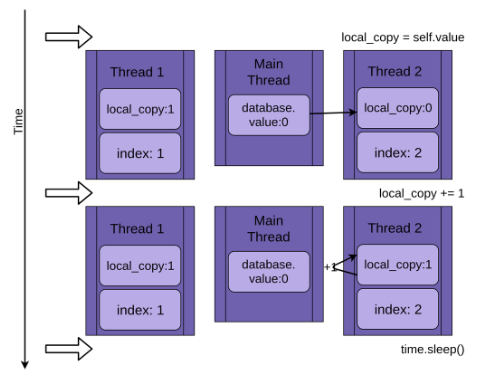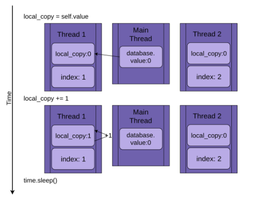 그 원인은 다음과 같다. 첫번째첫 번째 thread가 self.value의 값(0)을 local_copy로 복사해서 1을 증가시킨 후 다시 값을 self.value에 저장하지 않고 sleep에 들어간다. 첫 번째 thread가 sleep에 들어간 사이 두 번째 thread가 똑같이 self.value를 local_copy로 복사해서 1을 증가시키고 sleep에 들어간다. 이후 sleep이 끝난 첫 번째 thread가 값(1)을 다시 self.value에 복사를 하고 두 번째 thread도 같은 행위를 하면서 똑같은 값인 1을 self.value에 복사하게 되는 것이다.