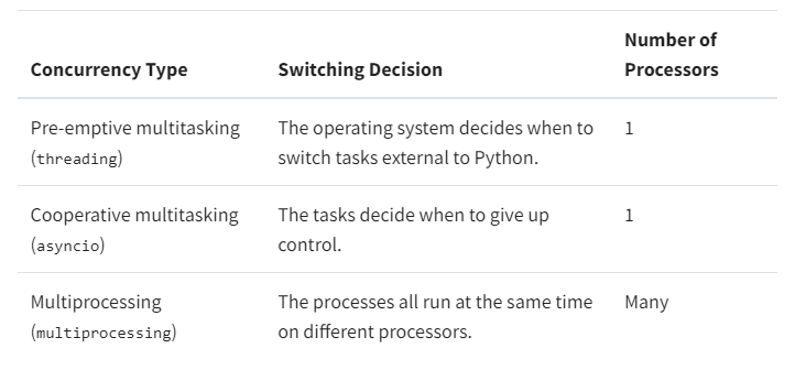 이러한 것을 multitasking이라고 하는데 Threading과 Asyncio는 작업을 차지하는 방식에서 차이가 있으며, Threading은 pre-emptive multitasking이고, Asyncio는 cooperative multitasking이다.