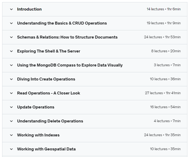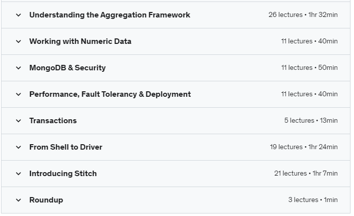 특히 나의 경우에는 mongodb를 처음에는 official document만 보고 기본적인 crud 기능을 사용하면서 배웠었는데 그때 가장 힘들었던 부분이 mongodb의 특성이 nested array나 nested document의 요소들을 건드려야 할 때였는데 구글이나 스택오버 플로우에 아무리 검색을 해봐도 만족스러울 만한 내용을 찾지 못했다. 하지만 해당 강의를 듣고는 이제는 그러한 부분에서는 더 이상 발목 잡히지 않을 것 같다.