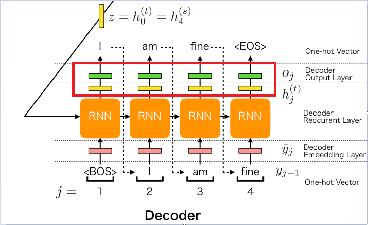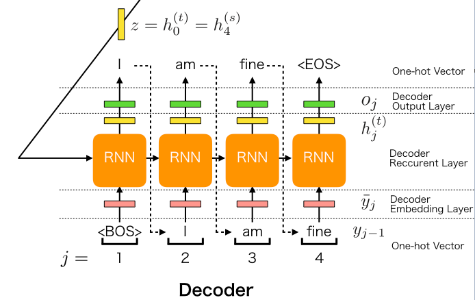 $$ h^{dec}_t = RNN_{dec}(emb_{dec}(\hat{y}_{t-1}),h^{dec}_{t-1}), \; where \; h^{dec}_0 = h^{enc}_m. $$