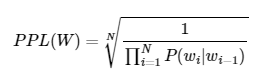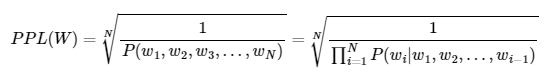 아래는 PPL의 수식이며 매 타입스텝의 출력값으로 나온 확률 값을 기하평균 해준다.