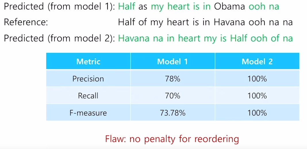 이러한 한계점을 보안하기 위해서 BLEU score이 제안되었다.