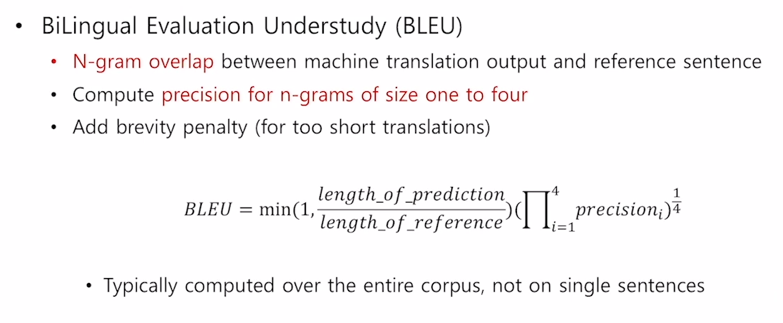 이 처럼 PPL은 언어 모델간 동일한 성능 평가 지표를 제안하였고 유용하게 사용되는 지표이지만 번역 품질의 성능을 제대로 반영하지 못한다는 단점이 있다.