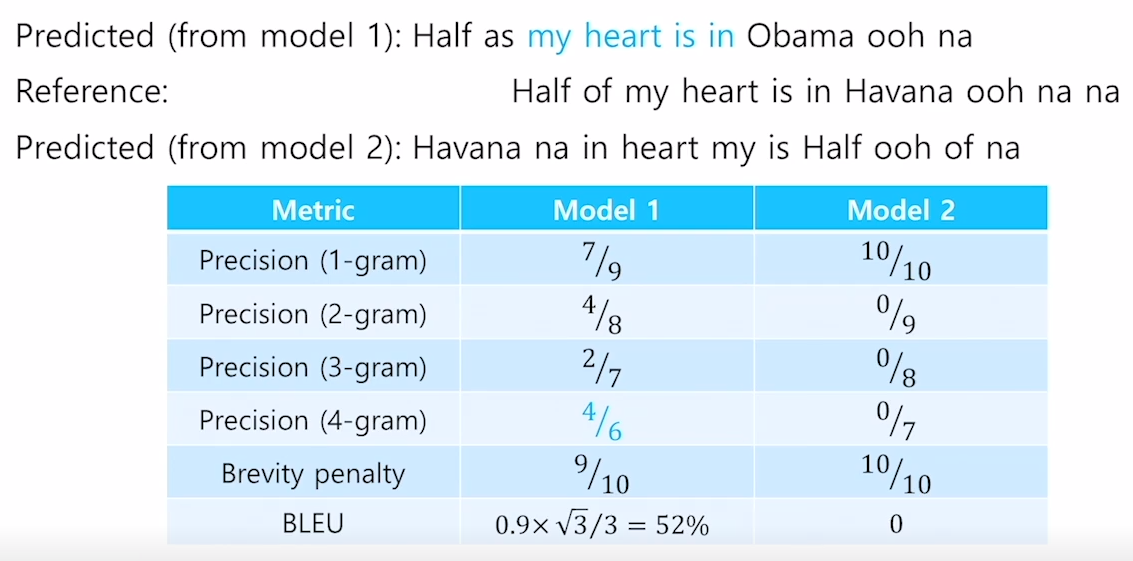 위와 같은 방법으로 four-gram 까지 precision을 구하고 Brevity penalty를 구하여 곱해주면 52라는 BLEU score를 얻게 된다.