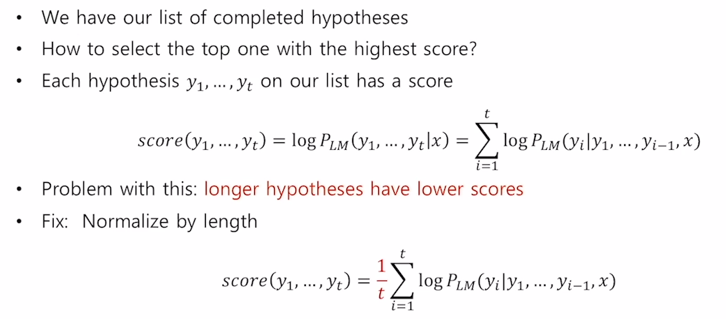 여기서 score를 길이로 normalize 해주는 이유는 사전에 정의해둔 T개의 타임스텝에 도달하기 이전에 <eos> 토큰을 생성하고 beam search를 종료한 문장들은 보통 더 낮은 score를 가지게 된다. 그러한 문장들을 normalize 해주지 않으면 최종 출력 값을 선정할 때 길이가 짧은 문장들이 더 좋은 score를 가지기 때문에 최종 출력 값으로 좀 더 유리한 score를 가질 수밖에 없다.