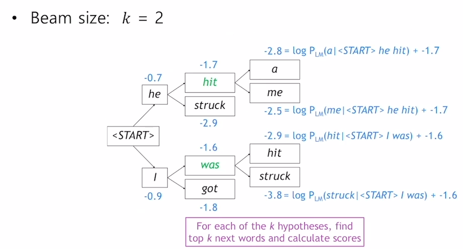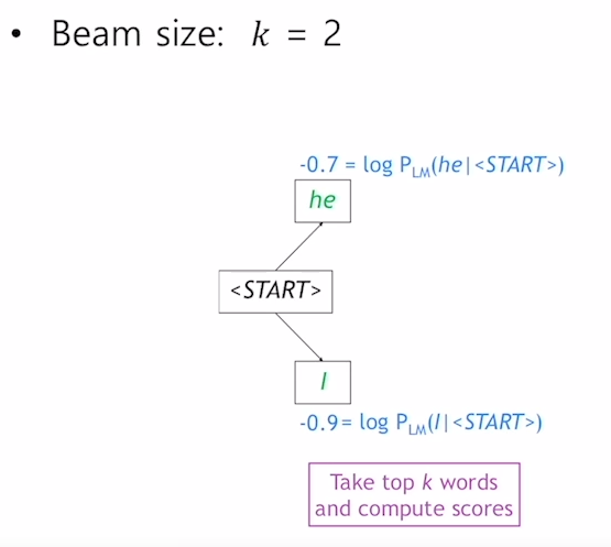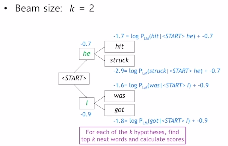 그리하여 beam search의 기본 아이디어는 매 타입스텝마다 모든 가능한 경우의 수를 고려하여 계산하는 것이 아닌 K개의 가장 가능성이 있는 경우의 수만을 추적해서 가능한 출력 값으로 보관하는 것이다.