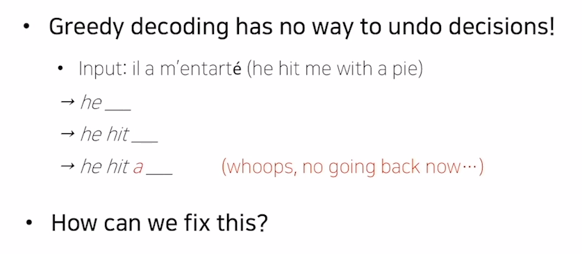 하지만 Greedy decoding의 문제점은 매 타임스텝의 최대 확률 값만을 고려하는 것이 전체 타임스텝으로 보면 적절하지 않은 문장을 출력으로 가지게 될 수 있다는 점이다.