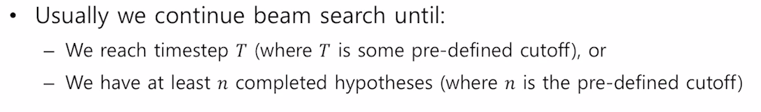 Greedy decoding에서는 생성과정중에 <eos> 토큰이 출력 값으로 나오게 되면 생성을 멈추는데, beam search는 아래와 같은 조건이 충족될 때까지 계속되게 된다.