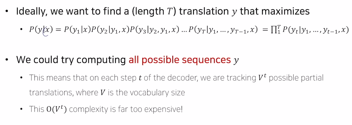 그렇다면 greedy decoding에서 하는 방식인 현재 타입스텝만의 확률을 고려하는 방식이 아닌 전체 타임스텝에 대하여 확률을 고려하여 출력을 하는 방법이 있지만 그러한 방법은 계산해야 하는 경우의 수가 기하급수적으로 늘어나게 된다.