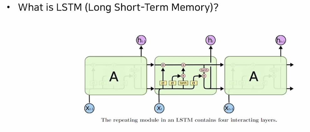 이러한 한계점을 극복하고자 LSTM이 제안 되었으며 LSTM은 input(X)와 단기기억을 담당하는 hidden state 그리고 좀 더 오래된 타임스텝의 정보를 담고자 cell state가 하나의 cell의 input으로 들어오게 된다.