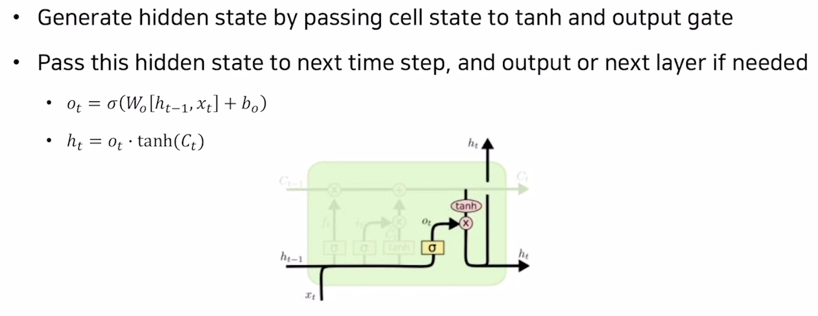 LSTM은 장단기 타입스텝을 기억하기 위해 hidden state와 cell state를 input으로 받고 4개의 gate를 거쳐 다음 타임스텝의 hidden state와 cell state를 출력하게 된다.