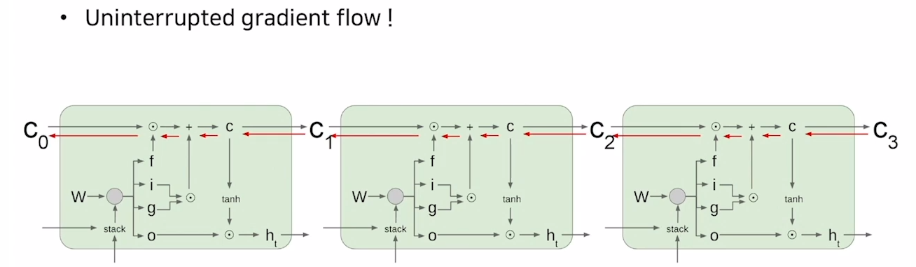하지만 LSTM에서는 cell state를 정보들을 단순히 내적과 덧셈을 함으로써 위와 같은 vanilla rnn의 문제를 해결하였다고 볼 수 있다.